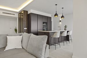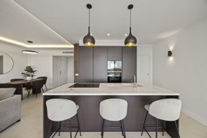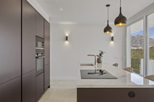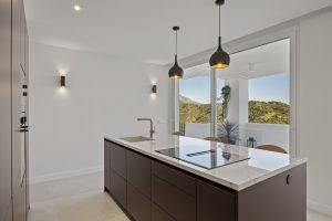 La cocina contemporánea destaca por su elegante isla de mármol, ideal tanto para cocinar como para disfrutar de las vistas panorámicas.