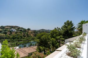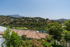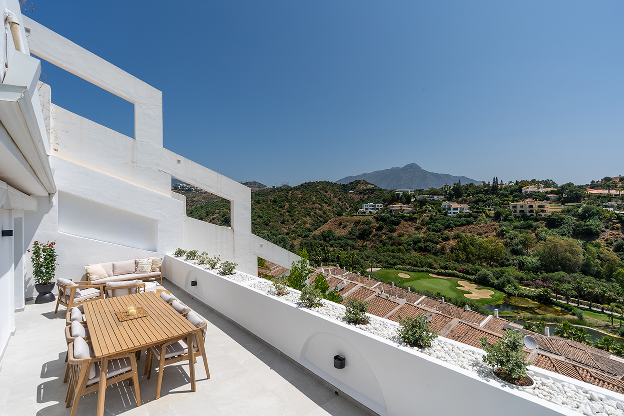 Amplio apartamento de golf totalmente reformado con vistas al mar, al campo de golf y a la montaña en La Quinta Golf, Benahavis.