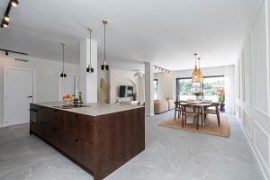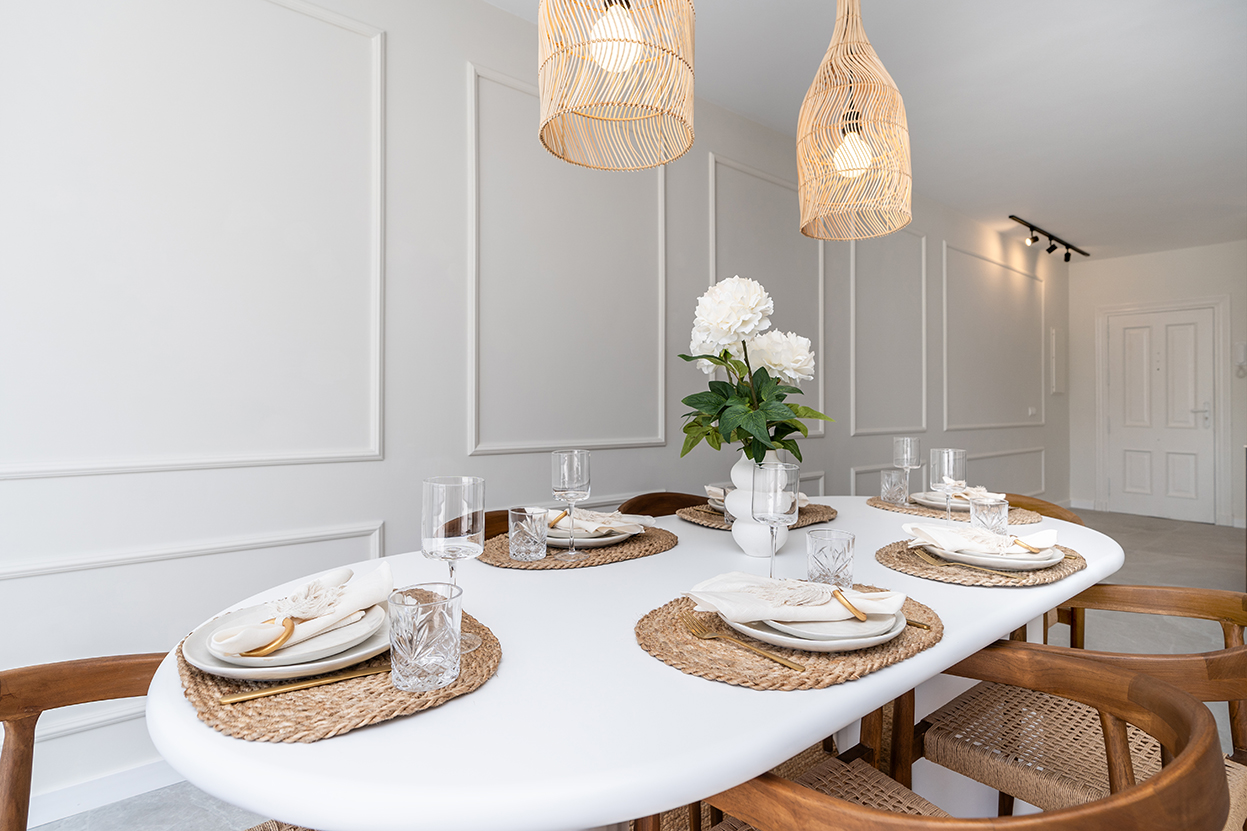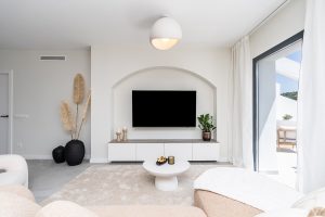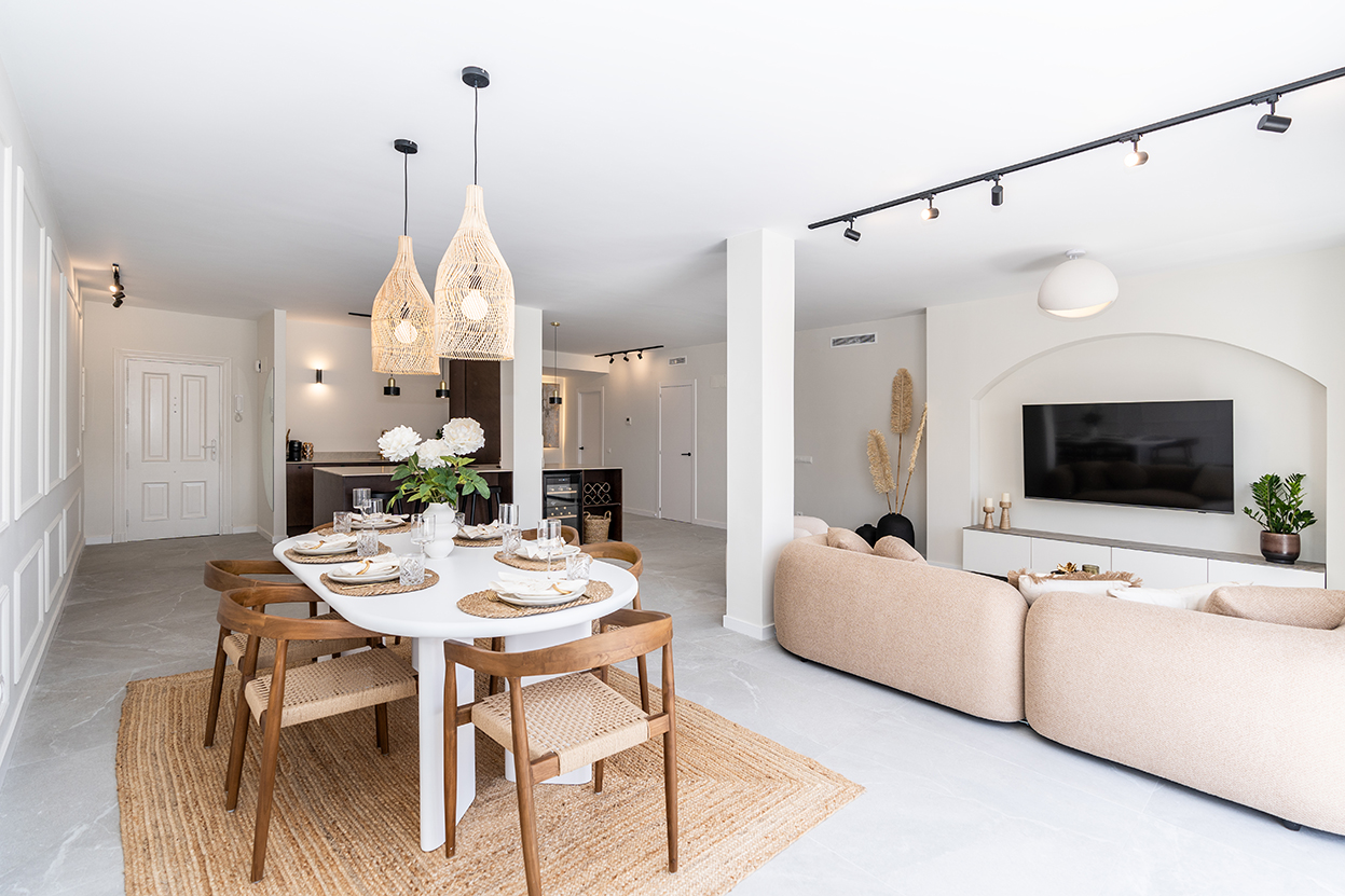 Esta propiedad contemporánea ha sido totalmente reformada y decorada con un alto nivel de calidad. Cuenta con un espacioso salón de planta abierta con zona de estar con TV, una mesa de comedor formal y una cocina totalmente equipada con paneles de roble e isla, todo ello con acceso a la amplia terraza con vistas al campo de golf, al lago, a la montaña de La Concha y al mar.