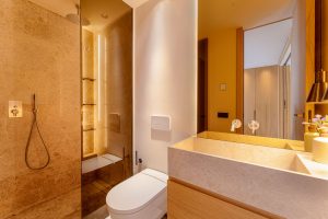Una escalera interior conduce al nivel superior donde se encuentra la suite principal, y ofrece una sensación de privacidad y serenidad con acceso directo a la terraza a través de un balcón francés. Los baños están equipados con accesorios y acabados contemporáneos, manteniendo un tono cohesivo y lujoso en todo el apartamento.