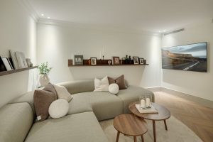La villa está distribuida en dos niveles, diseñados para maximizar la tranquilidad y la comodidad. Al entrar, un recibidor iluminado conduce a una sala de estar formal con techos altos y ventanales de lujo de Roman Clavero, que integran la luz natural y enmarcan vistas espectaculares al jardín y la piscina.